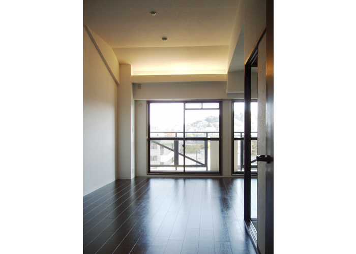 3LDKの間取りを2LDKに変更し、現在の生活スタイルに合わせた広いリビングへ変更。最上階のためリビングの高さが2650mmあり、またR形状であるのを活かし、間接照明を仕込んだ。異なった天井の形状を利用し、デザイン貼りにすることでリビングとキッチンを視覚的に区切った。