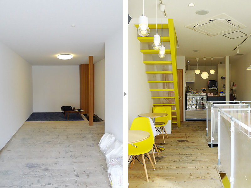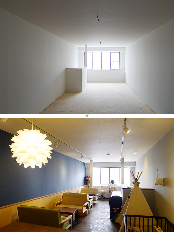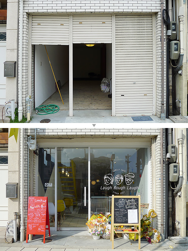 - セミナーに通いながら旦那さんと楽しんでいたのが「物件探し」です。店舗物件を見て、自分たちのプランにはまるかどうか想像する遊びですが、たまたまここが見つかったんです。ここと奥隣が対になっていて、奥隣は居抜きでそれなりに良い雰囲気でしたが、道路に面していること、子どもの遊び場にできる広さがあることの2点で、こちらに決めました。