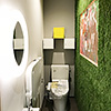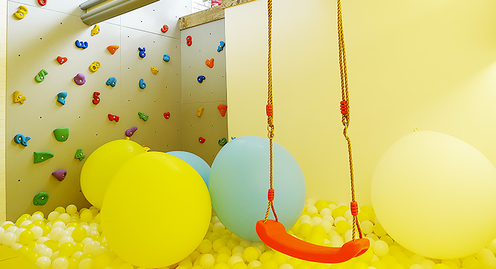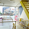 大通りの交差点に面した立地を活かし、子どもが思わず入りたくなるような楽しい仕掛けが必要と考えた結果、キーカラーをインパクトのある黄色に、ファサード(建物正面)は道行く人からも見えるよう全面ガラス張りにしました。お店としては1階の客席数をもう少し確保すべきでしたが、集客と認知を優先して一部吹き抜けにし、地下のボルダリング壁やボールプールで子どもたちが遊ぶ姿が見えるように設計。