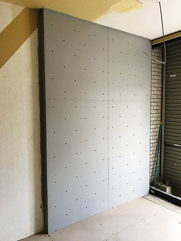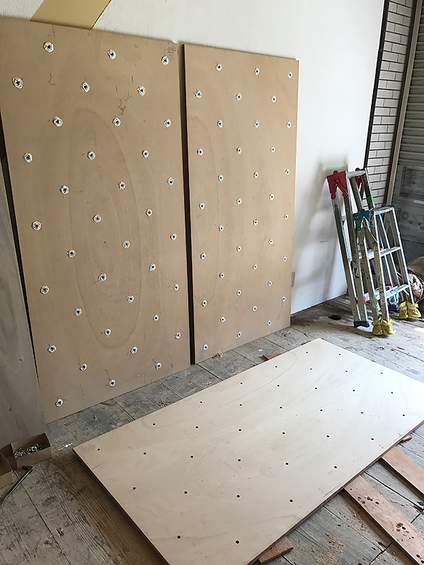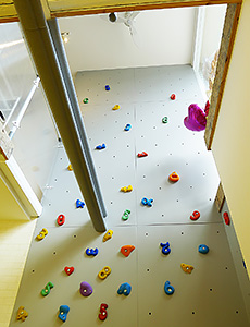 - ボルダリングの壁は1階の少し下あたりまで登れて、それより上は飾りなんです。