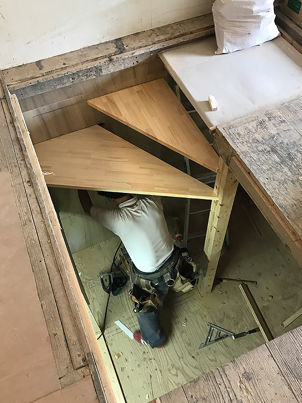 工事前の現場調査の時、1F階段の架け替えとB1階段の架け替えを聞いて、少し大変かなと思いました。でも帰りの道中に施工の進め方を考えているうちに段々と頭の中で出来上がり、不安がなくなって行きました。見えない天井裏の梁方向やその梁の架け替え、補強方法は考えれば考える程楽しくなってきます(病気です笑)。階高の高い階段は良いのですがストリップ階段(※)なので、強度が気になるのと、あとは費用です。