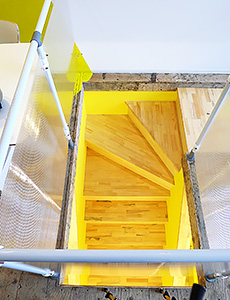 ※:つま先が当たる部分・蹴込み板がなく向こうが透けて見える階段。今回は採光と安全確保のため透明の板を入れています。